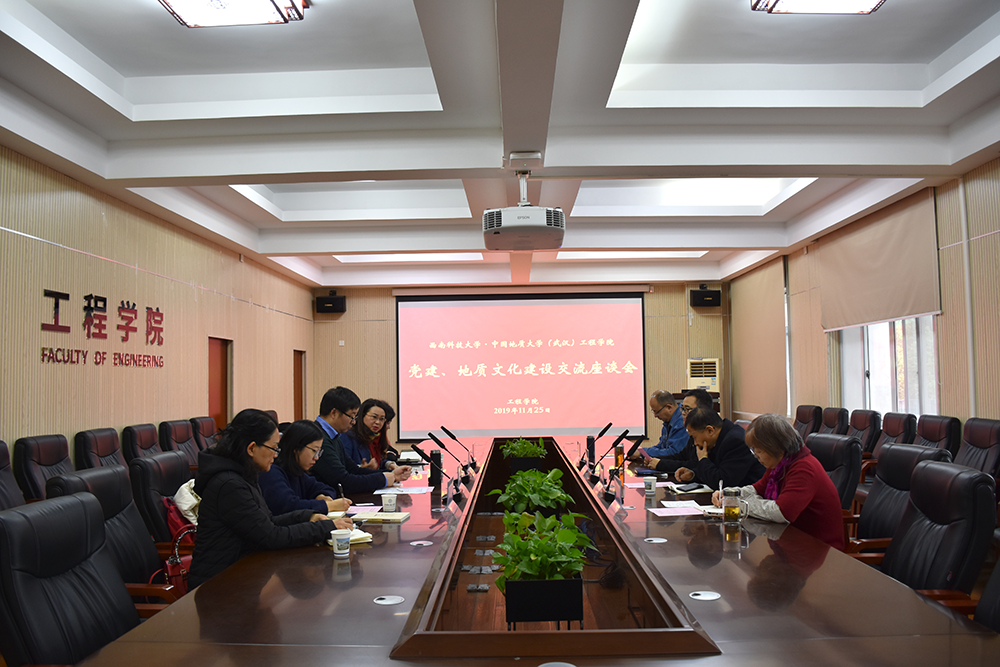 (通讯员:杨冠青)2019年11月25日上午,西南科技大学环境与资源学院(以下简称“环资学院”)副书记陈莉等一行5人来我院进行党建、地质文化建设交流座谈,学院党委副书记江广长,副院长窦斌,工程地质与岩土工程系党支部书记贾洪彪,党委委员组织人事秘书杨冠青参加了座谈。会议由窦斌主持。