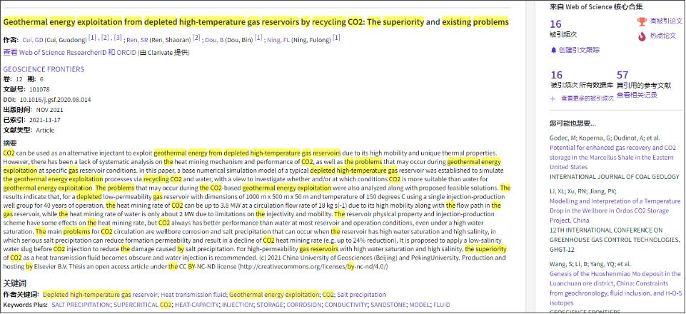 (通讯员:黄静)根据2022年3月基本科学指标数据库(Essential Science Indicators,简称ESI)最新数据显示,我院崔国栋副教授于2021年在国际地学期刊Geoscience Frontiers上发表的学术论文“Geothermal energy exploitation from depleted high-temperature gas reservoirs by recycling CO₂: The superiority and existing problems”入选ESI热点和高被引论文(Hot and Highly Cited Paper)。该论文第一作者兼通讯作者为崔国栋副教授,中国地质大学(武汉)工程学院为第一署名单位。