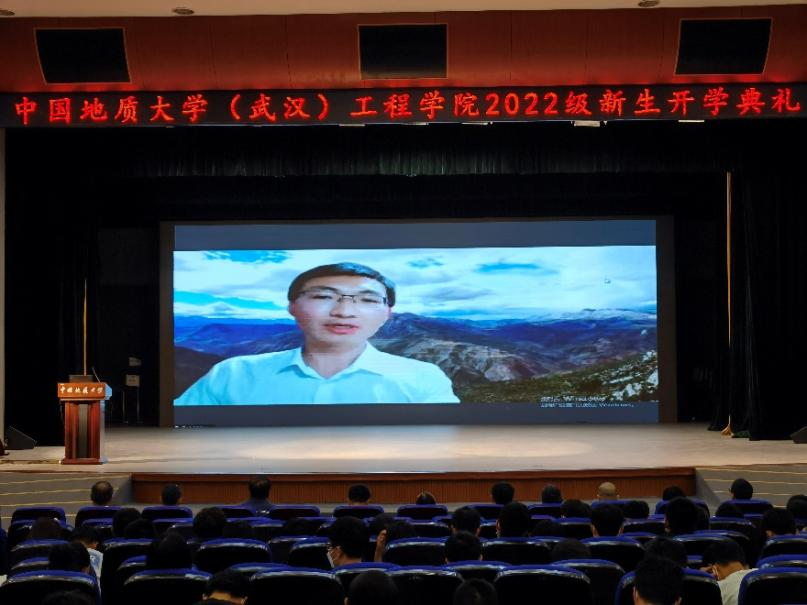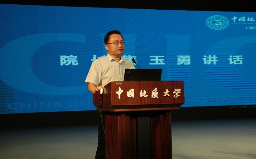 工程学院院长焦玉勇教授发言。他指出,工程学院是培养人才的重要阵地,七十年的厚积薄发,培养无数优秀学子、书写工程内涵。他强调,当今新时代面临着伟大变革,学子们要胸怀大志、秉持真理,不断拓宽视野,提升人文素养与科研能力;要立于当下,着眼未来,为攻克地质工程领域难题不懈奋斗、贡献力量;在求学之路上,要做良善之人、栋梁之材,培养完整人格,勇担时代使命。