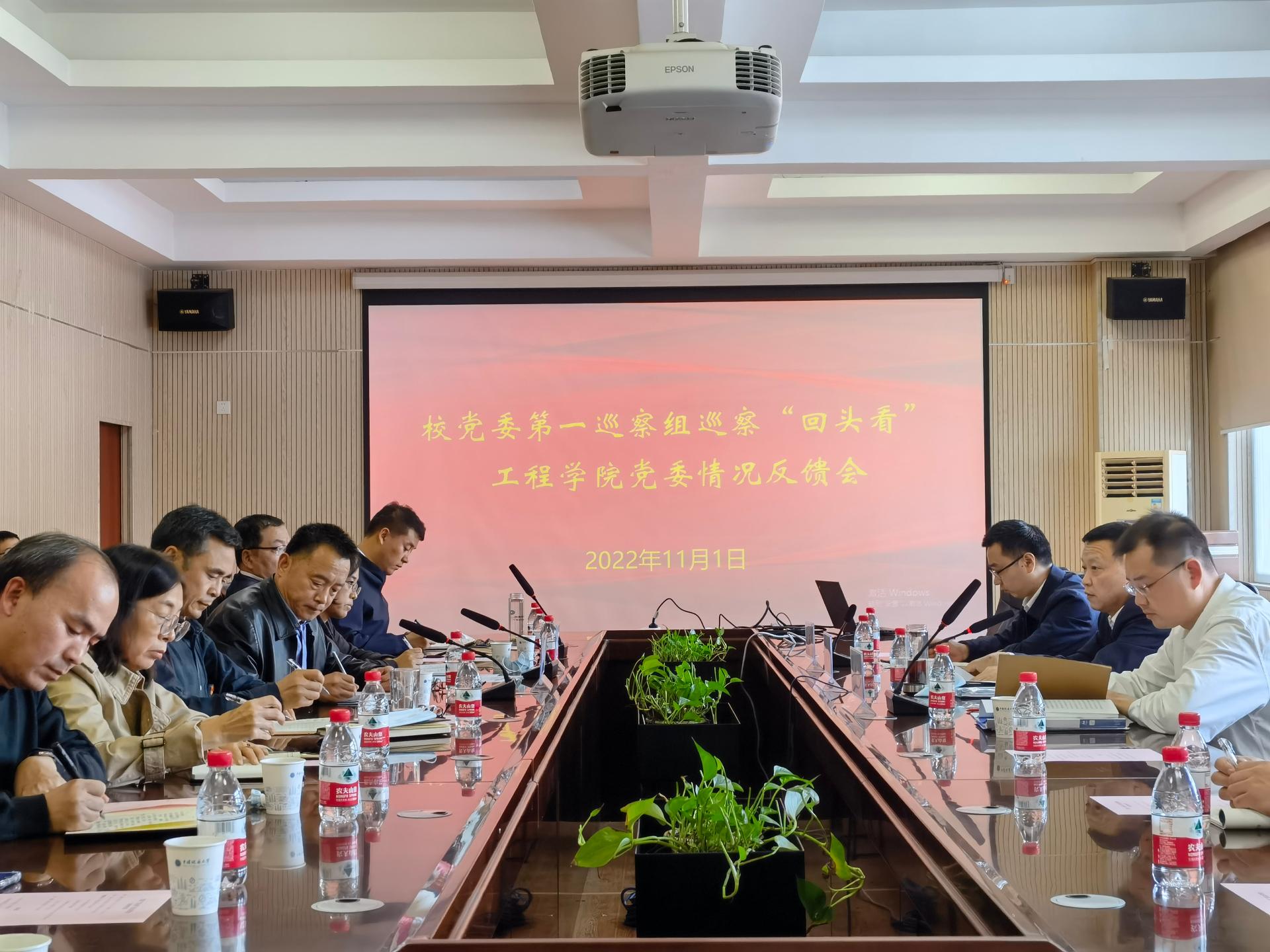 (通讯员 陈婵)11月1日,校党委第一巡察组向工程学院党委反馈巡察“回头看”情况。巡察组副组长汪再奇代表巡察组向工程学院党委书记李红丽,党委副书记、院长焦玉勇,领导班子和干部群众反馈了巡察“回头看”情况。校党委副书记王林清对工程学院党委落实巡察整改任务提出了要求。李红丽在反馈大会上作表态发言。焦玉勇主持会议。