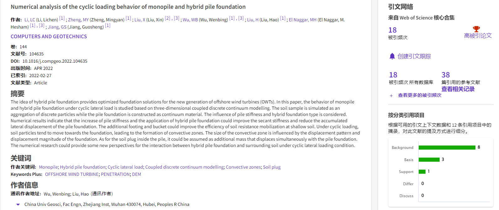 根据2022年11月基本科学指标数据库(Essential Science Indicators,简称ESI)最新数据显示,工程学院勘察与基础工程系吴文兵教授团队于2022年在国际岩土工程数值模拟权威期刊Computers and Geotechnics上发表的学术论文“Numerical analysis of the cyclic loading behavior of monopile and hybrid pile foundation”入选ESI高被引论文。该论文第一作者为勘察与基础工程系博士后李立辰,通讯作者为吴文兵教授,中国地质大学(武汉)工程学院为第一署名单位。