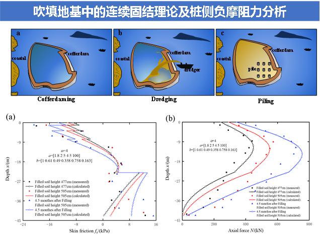 近年来,我国东南沿海和南海地区的填海工程蓬勃发展,新近吹填地基的固结效应十分显著,地基土内超静孔隙水压力的消散将引起地表的整体沉降,对吹填地基上基础工程的稳定产生不利影响。不同于预制桩基础贯入引发的超静孔隙水压力固结过程,吹填地基的固结过程分为桩基贯入前的整体一维固结和桩基贯入后的轴对称三维固结,现有理论无法模拟这一不同固结过程的继承关系。本研究原创性地提出了连续固结模型,实现了不同阶段固结问题在时域上的继承与发展,并通过引入自主开发的桩-土相互作用弹塑性模型的方式将固结与桩基长期变形的关系联系起来,实现了吹填地基上桩基础长期侧摩阻力发展的预测,研究揭示了吹填地基上侧摩阻力尤其是负摩阻力的发展特性,并通过参数分析提出了打桩时间优化方法。