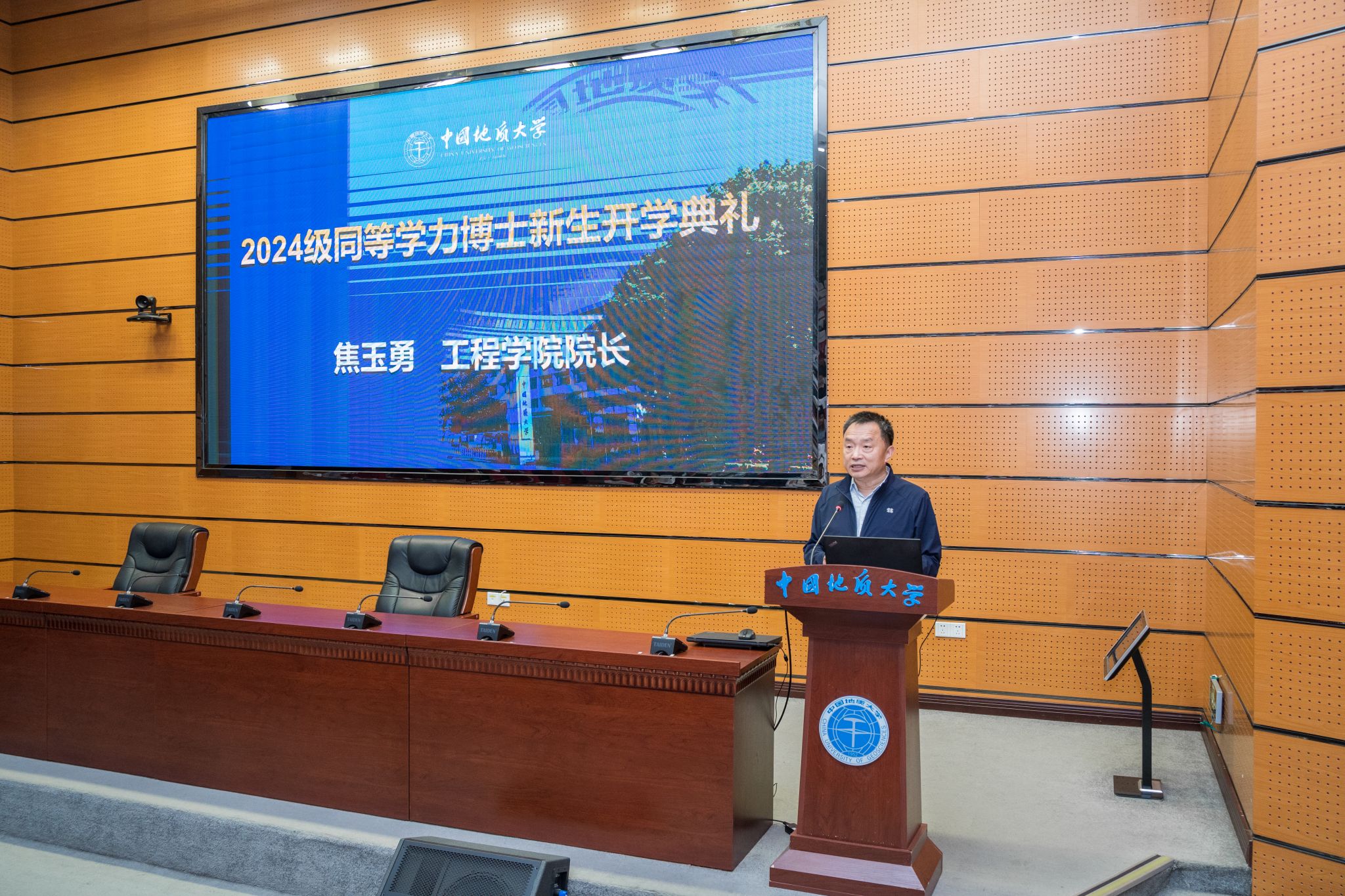 培养单位代表、工程学院院长焦玉勇教授结合地大72载办学史与地质科学家精神传承史,给新生们提出三个期望:一是要时刻牢记胸怀祖国、服务人民的爱国精神,追求精深科研,服务科技革新、产业变革,服务经济社会发展;二是在研究的过程中要有勇攀高峰、敢为人先的创新精神,要能在顺境中独立思考、在逆境中迎难而上,肩负起时代赋予我们的科研创新重任;三是要有集智攻关、团结协作的协同精神,既要独立思考、深入钻研,也要集体协作、合作共赢,利用好学校资源。焦院长表示各培养单位也会针对性为同学们提供服务保障,做大家充实研究生涯中的加油站、补给点,希望同学们传承弘扬科学家精神,勇担科研报国的理想信念,为全面建设社会主义现代化国家,全面推进中华民族伟大复兴作出新的更大的贡献。