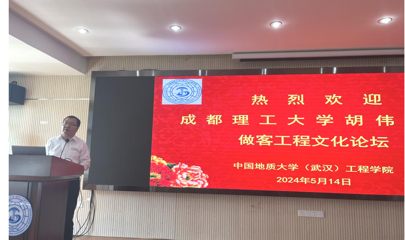 (通讯员 刘智琪 黄静)2024年5月14日下午,应工程学院唐辉明教授的邀请,成都理工大学胡伟教授来校访问并做客工程文化论坛,工程学院副院长王亮清教授主持论坛,100余名师生聆听了讲座。