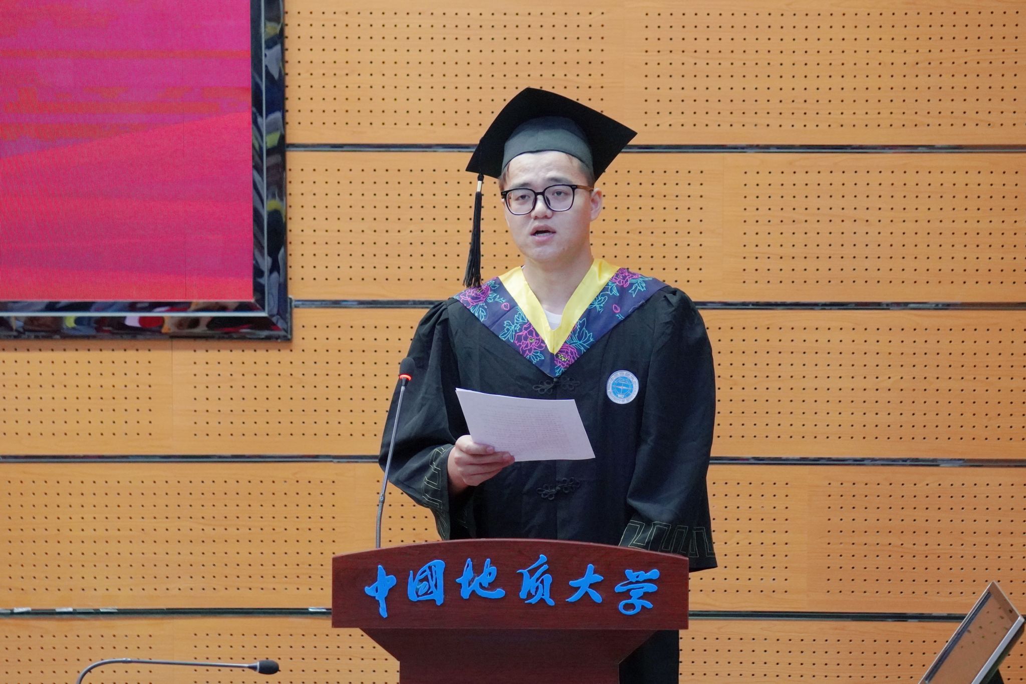 毕业研究生代表王海艳发言。她深情分享了过去三年在人工智能与地质灾害识别领域的科研成果以及在“挑战杯”赛场上斩金夺银的挑战成长与心路历程,希望同学们无论投身科研攻关、工程建设还是扎根基层都要以“专业报国、使命担当”为志,接续奋斗,勇攀高峰。