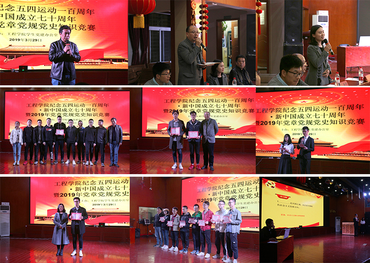 2019年3月29日晚18:30,工程学院“纪念五四运动一百周年·新中国成立七十周年暨2019年党章党规党史知识竞赛”复赛、决赛在东区教职工活动中心举行。工程学院党委书记陈飞、副书记江广长,校党委组织部李雨竹,工程学院学工组辅导员丁继国、文新、王焱出席活动。