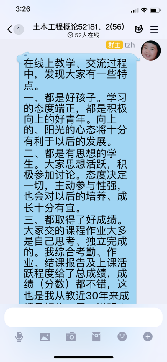 除了云课堂正常授课之外,为了拓宽同学们的视野,增加他们的学习和热情,我系老师还多次组织了校外著名专家学者的讲座授课。3月份,应工程学院副院长王亮清教授邀请,中建三局基础设施建设投资有限公司技术部经理、武汉雷神山医院(医护区)总工贾瑞华高工,在线为我校本科生上专业讲座课并作学术报告。正是有了老师和学生们的共同努力,我系这一学期“停课不停学”的所有课程都达到了圆满的效果。