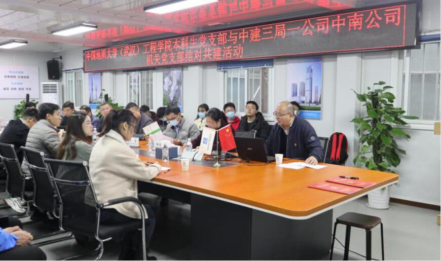 (通讯员:陈启维 李振华)为进一步探索校企合作人才培养模式,引导学生前置行业认知,中建三局一公司中南公司机关党支部与中国地质大学(武汉)工程学院道桥与建筑专业本科生党支部于2020年11月22日在光谷中心项目总部开展了“党建引领·校企共建”结对共建活动。中建三局一公司人力资源部副经理李骄健,中建三局一公司中南公司副总经理、超高层管理中心负责人梁劲松,副总经理王雅林,机关党支部书记陈婷华,中国地质大学(武汉)工程学院党委副书记江广长,学生办公室主任文新,辅导员王俊、李振华以及双方的党员代表参加本次活动。