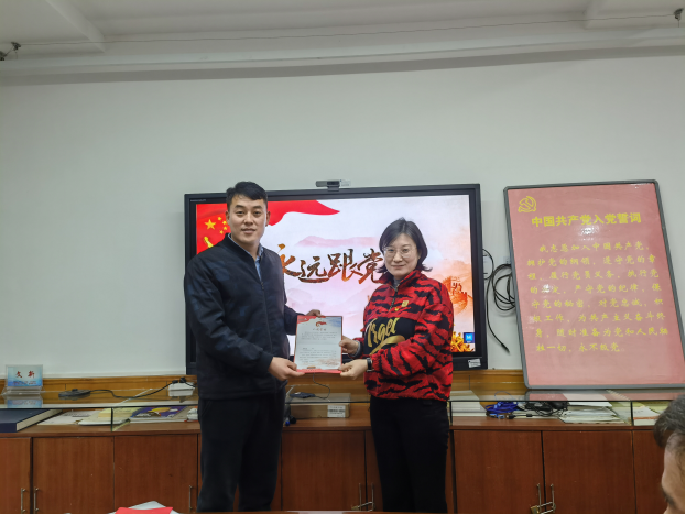 最后,全体党员为陈飞、张美霞和黄静三位同志过“政治生日”,为三位同志颁发“政治生日”纪念卡。