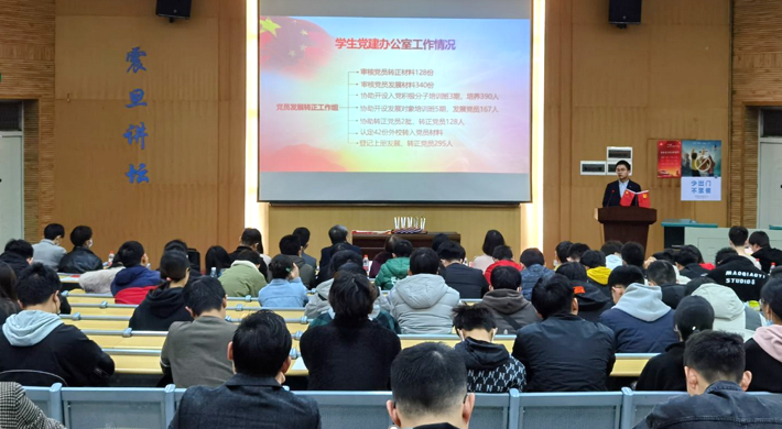 此后,工程学院第八届学生党建办公室副主任寇桓嘉同志汇报2020年度学生党建办公室工作情况。寇桓嘉同志向参会同志们详细汇报了工程学院2020年度党员考察、培养及发展转正工作,全年协助院党委开设入党积极分子培训班三期,培养入党积极分子390人,开设发展对象培训班五期,发展党员167人,共有2批党员转正,转正党员128人,完成外校转入42名学生党员的认定工作。另外还介绍了组织生活巡视情况、全体学生党员信息库建立、《工程学院学生党建工作指导》(第四版)编写等方面内容,最后表示要将学生党建办公室打造为服务院党委和学生党支部的“老黄牛”,以优异成绩向党的百岁华诞献礼。
